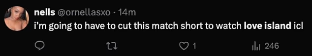 The episode, which featured heated moments and dramatic interactions between cast members, coincided with kick-off for the AFCON final — a major sporting event watched by millions across the world. Many Love Island followers were left torn between watching their favourite show and the football match, leading to complaints online about the scheduling decision.